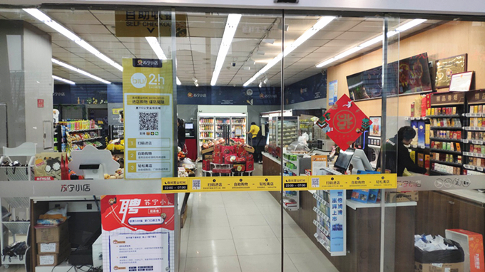 區別于常規的無人便利店,在更換為電子自動門之后,蘇寧小店Biu×24h白天安排店員正常經營,夜間10點到清晨7點則改為無店員值班,化身無人便利店。消費者需掃描電子會員碼進店,使用自動收銀機即可進行自助掃碼結賬。