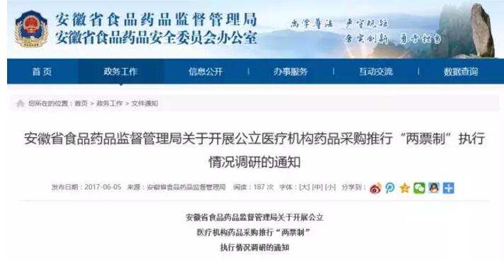 通知顯示,此次調研共計一個月零五天,即從公示的6月5日起至7月10日止。應該說,此次安徽就兩票制執行情況的調研,是官方正視兩票制執行問題的良好發端。鑒于安徽省是醫改試點省份,其調研的情況以及征集的建議,很有可能會被國家采納進而推廣全國。果真如此,兩票制或有重大調整,也就只是時間的事兒了。