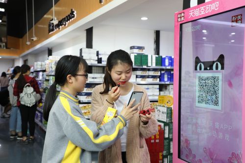 在這所男女比例3:7的高校,女大學生成為了絕對的消費主力軍。天貓互動吧派樣機、天貓魔鏡擠滿了女大學生,按照界面的指引進行操作體驗,試口紅。