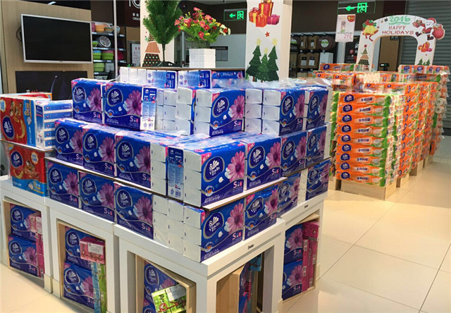 衛生紙——這類商品的在各個家庭中的日常消耗量很大,所以在超市里的銷售速度往往是最快的,很適合采用量感陳列的方式,并要注意及時補貨,盡量避免超市貨架出現空缺。