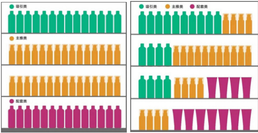 將主推商品擺在超市貨架黃金位,吸引類和配套類商品分別擺在貨架上部分和下部分的位置(圖左示)。當然也可以更靈活地將吸引、主推和配套商品穿插擺放(圖右示)。