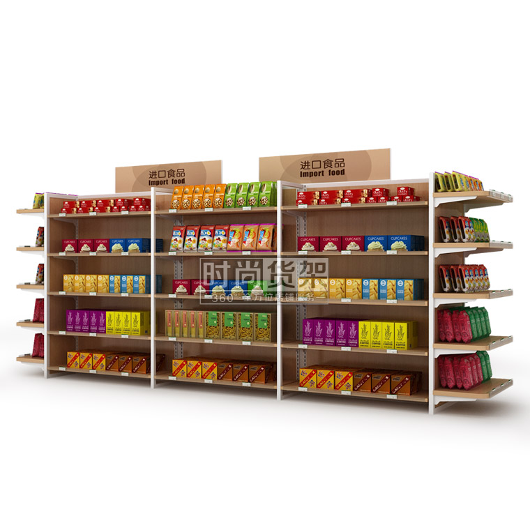 【產品名稱】便利店雙面食品貨架/進口食品貨架/木背板零食展示架