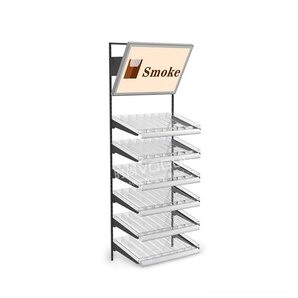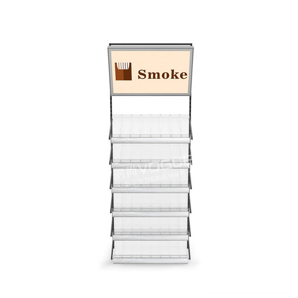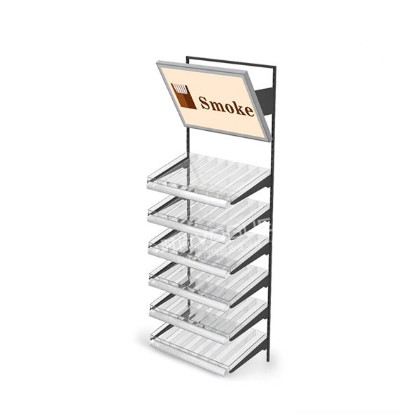 【描述】此款香煙采用鋼制結構,冷軋鋼工藝讓貨架整體更穩固;亞克力透明材質層板,自帶分隔功能,采用注塑一體成型,即可將香煙分類陳列,也方便拆卸清理;掛墻式的結構,只需兩根立柱,增強了店鋪陳列的通透性,卡扣式的托臂設計,讓層板間的間距調節更靈活,可以更好地適應小型便利店的陳列需求