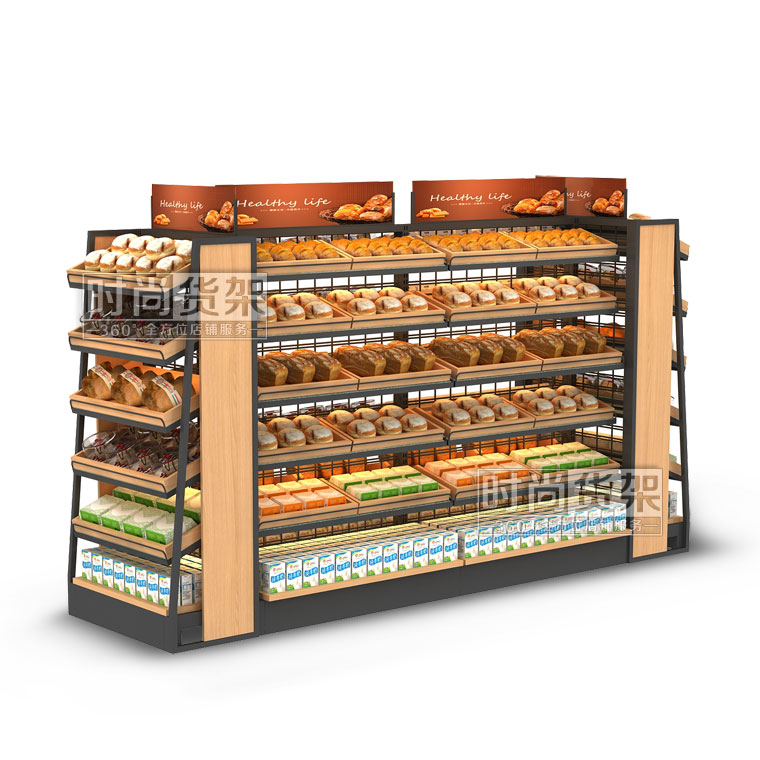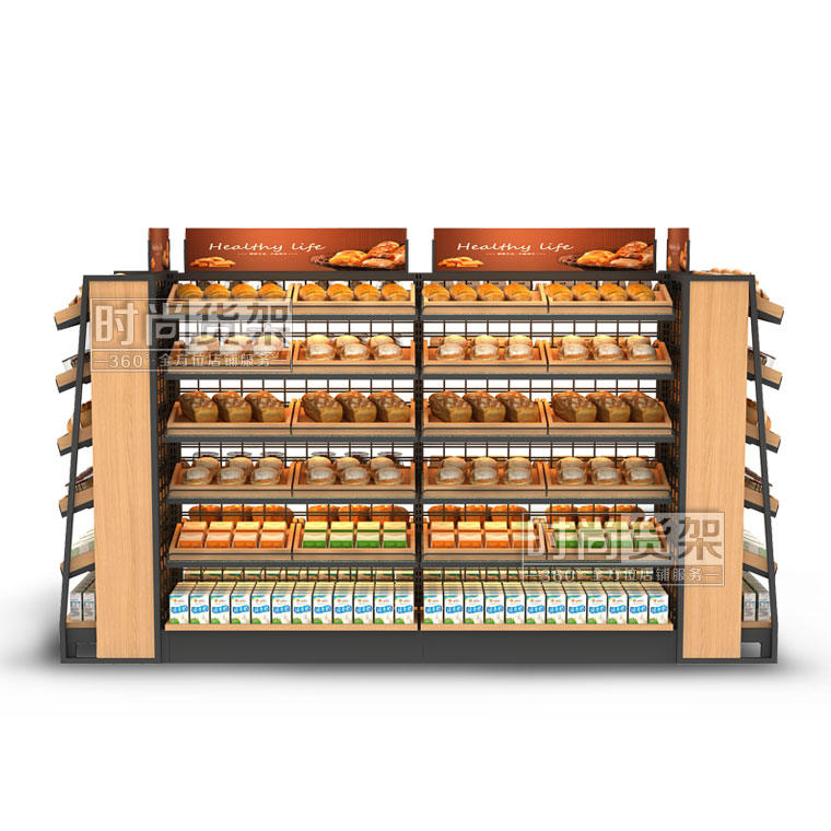 這款便利店面包架子為雙面網背板貨架,如需了解其他款式面包架,歡迎咨詢便利店貨架廠家【時尚貨架】客服。