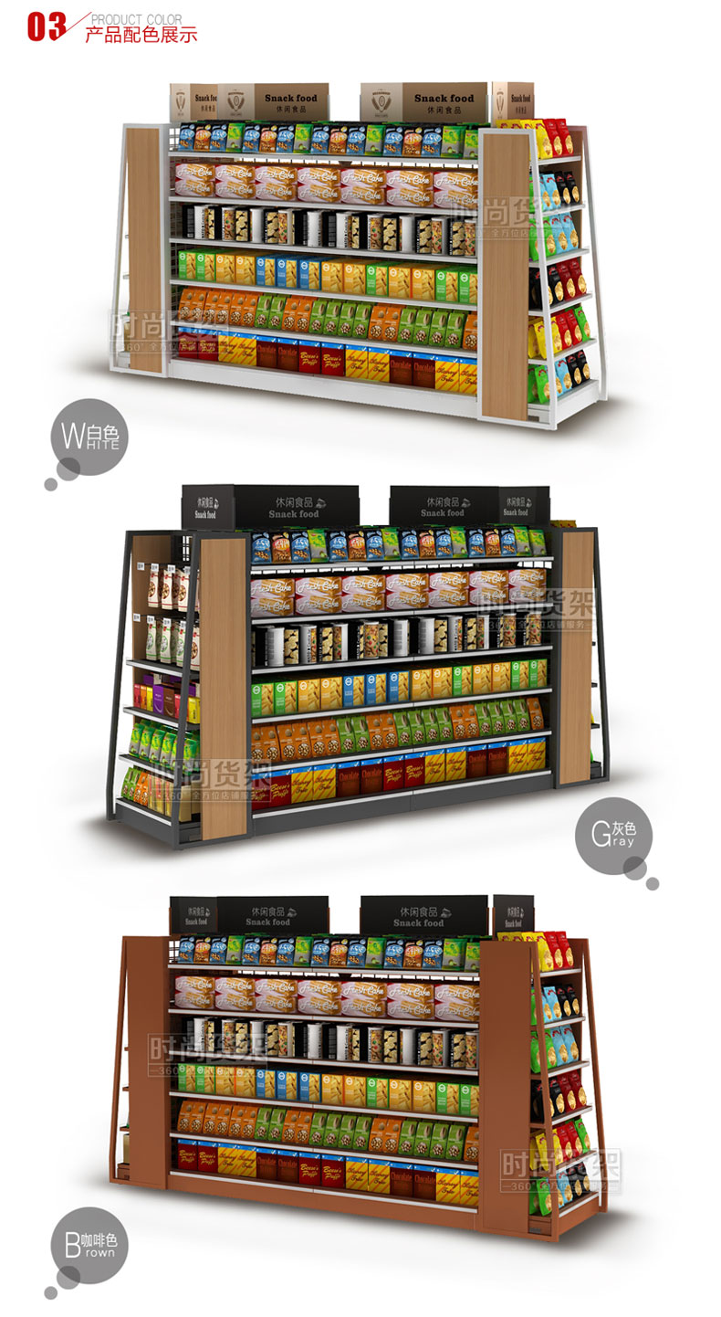 此款貨架為超市貨架廠家時尚貨架專為超市食品區(qū)域打造,整體框架由優(yōu)質(zhì)冷軋鋼材精制而成,承重性強(qiáng)。