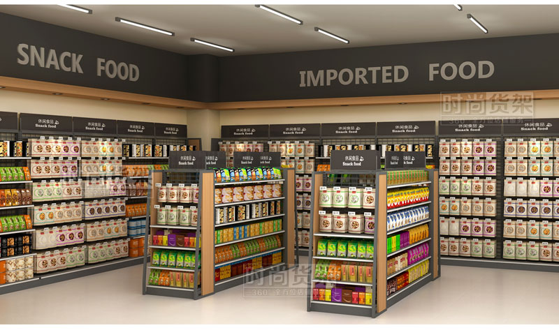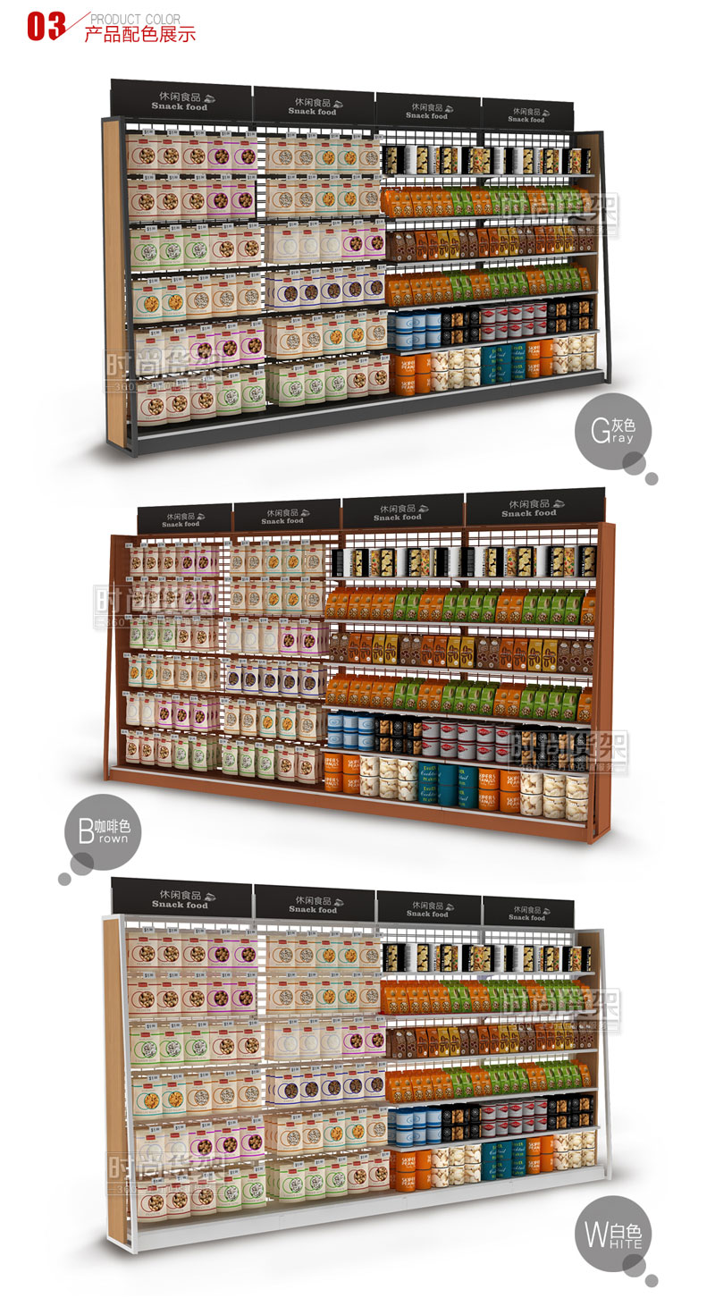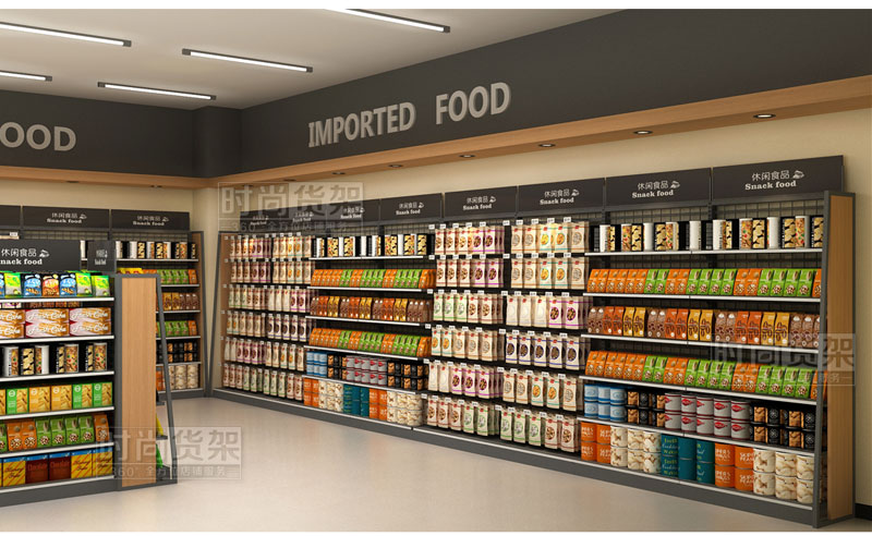 這是時尚貨架專為超市食品區打造的超市單面零食貨架,想了解超市雙面食品貨架請點擊:http://m.imgkd.cn/supermarket/spzsq/103.html。